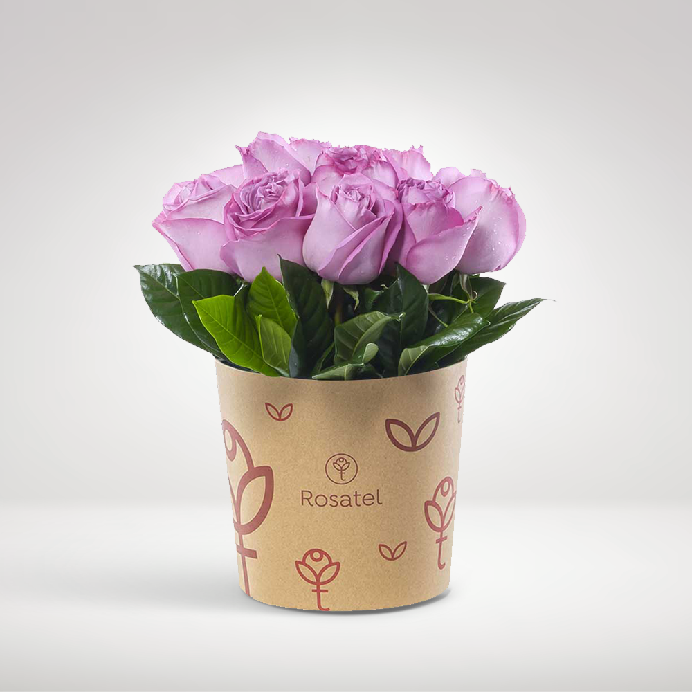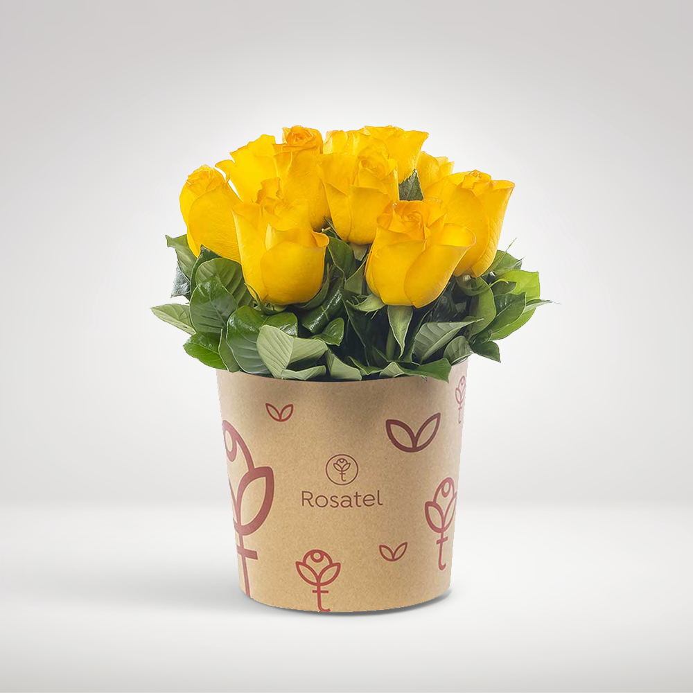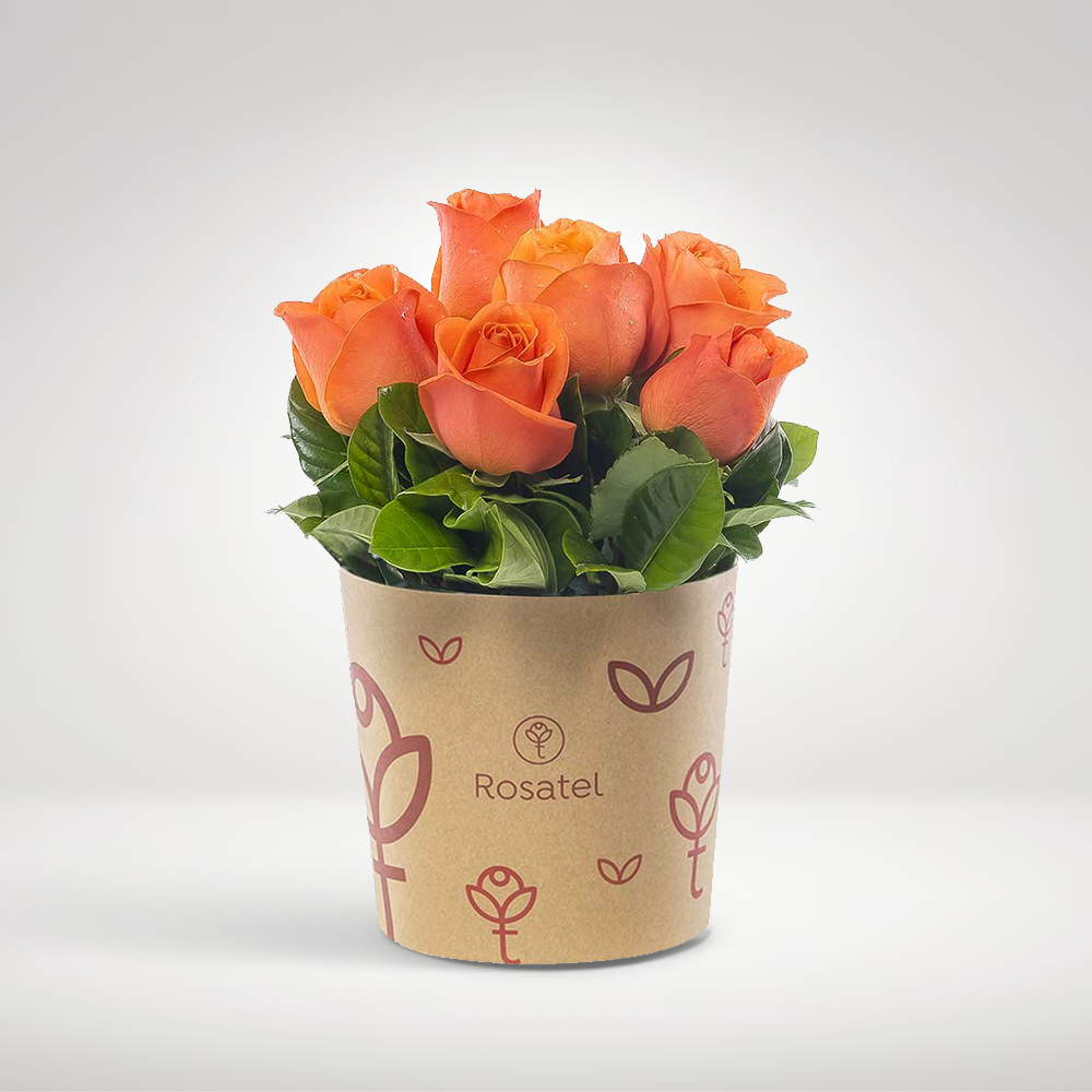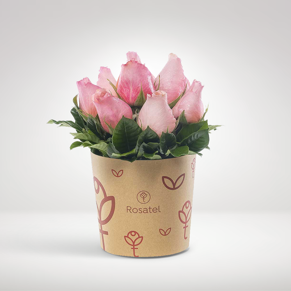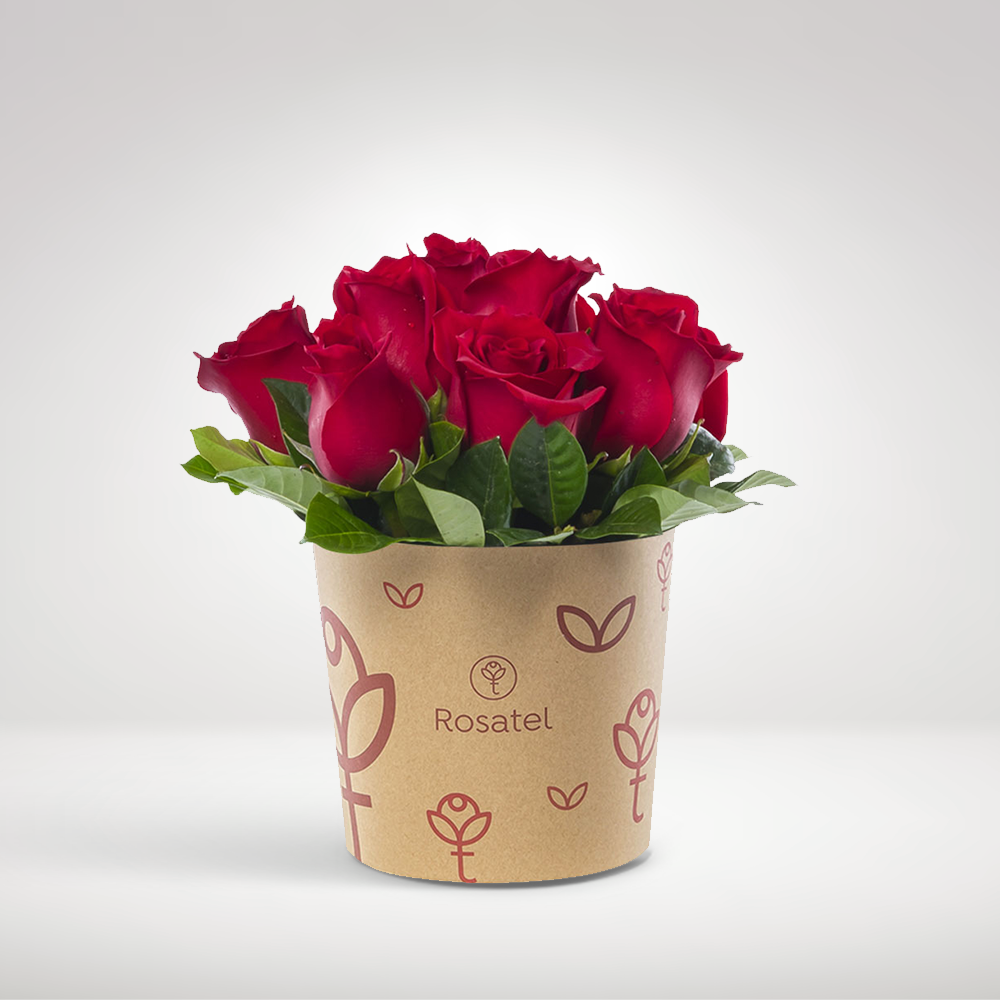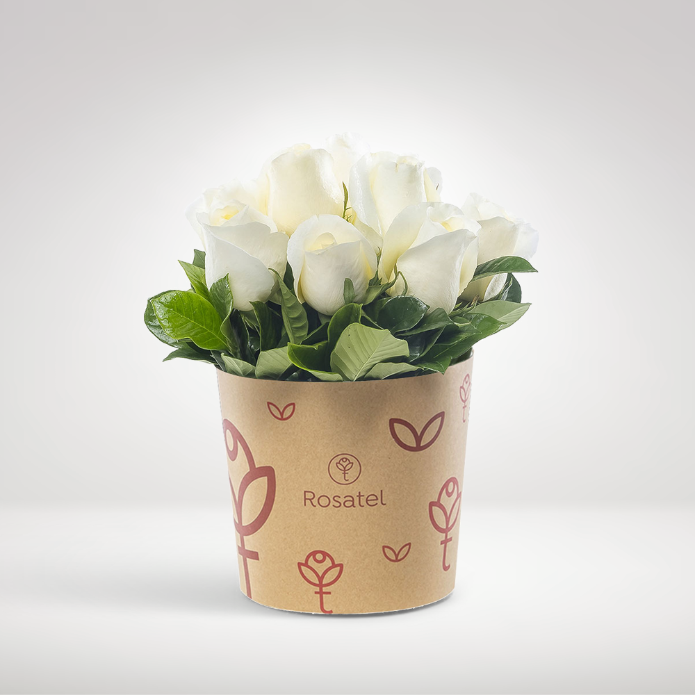 Arreglo 25 cms. alto aprox. Sombrerera 3R natural mediana Rosatel (15 cms) presentación ecoamigable impresa en material 100% reciclado con 10 rosas y follajes gardenias.